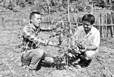 8月17日,湖南省隆回縣小沙江鎮(zhèn)農(nóng)業(yè)綜合服務(wù)站站長康永宏(左)在該鎮(zhèn)黃灣村指導(dǎo)村民李榮兵對甜茶葉進行栽培管理。