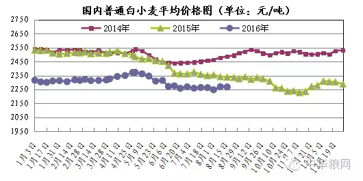 今年部分主產(chǎn)地區(qū)小麥受災(zāi),產(chǎn)量質(zhì)量雙降,質(zhì)量較好的小麥數(shù)量偏少。8月份以來小麥收購價格呈現(xiàn)溫和漲勢,短期內(nèi)結(jié)構(gòu)性和區(qū)域性行情較為明顯。本周華北黃淮地區(qū)小麥價格普遍上漲10-20元/噸,新麥收獲已有50多天,小麥集中收購高峰已經(jīng)過去,市場糧源有所減少,托市小麥收購力度不減。預(yù)料8-9月份小麥價格還能上漲,但是過程仍顯乏力。