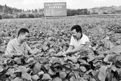 8月19日,湖南省隆回縣麻塘山鄉(xiāng)橫排村大學生周建國(左)與該鄉(xiāng)農(nóng)業(yè)綜合服務站站長楊思源在獼猴桃苗圃基地察看苗木長勢和交流栽培管理技術。周建國2010年大學畢業(yè)后,回鄉(xiāng)自主創(chuàng)業(yè)栽培了200多畝優(yōu)質(zhì)獼猴桃,嫁接培育了翠玉、東紅、金艷、黃金果、翠香等6個獼候桃系列優(yōu)良品種,苗木通過網(wǎng)絡平臺銷往全國各地。 賀上升攝