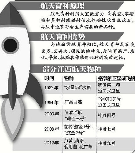 2012年6月29日上午10時03分,伴隨“神舟九號”載人飛船返回艙順利著陸,省農(nóng)科院代表中國南方航天育種技術(shù)研究中心搭載的蘆筍、油茶、食用菌、花卉等農(nóng)作物種子也隨之成功返回,再一次壯大了我省航天物種的“陣容”。據(jù)統(tǒng)計,截至目前,已有60多種江西特色作物100多個品種飛入太空。