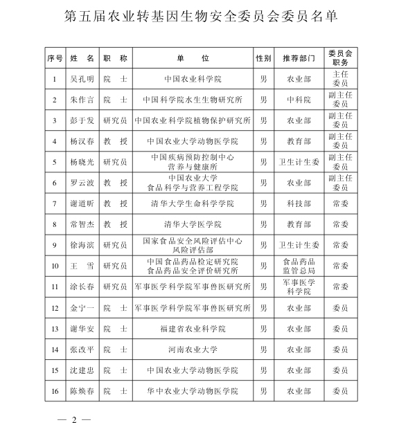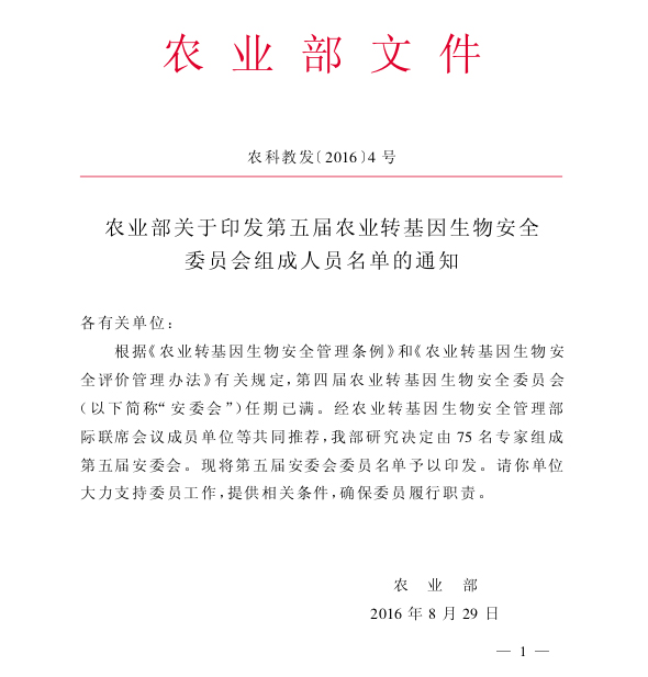 根據(jù)《農(nóng)業(yè)轉(zhuǎn)基因生物安全管理條例》和《農(nóng)業(yè)轉(zhuǎn)基因生物安全評價管理辦法》有關(guān)規(guī)定,第四屆農(nóng)業(yè)轉(zhuǎn)基因生物安全委員會(以下簡稱“安委會”)任期已滿。經(jīng)農(nóng)業(yè)轉(zhuǎn)基因生物安全管理部際聯(lián)席會議成員單位等共同推薦,我部研究決定由75名專家組成第五屆安委會?,F(xiàn)將第五屆安委會委員名單予以印發(fā)。請你單位大力支持委員工作,提供相關(guān)條件,確保委員履行職責(zé)。