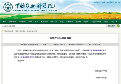 昨日,中國(guó)農(nóng)業(yè)科學(xué)院在其官網(wǎng)發(fā)布聲明稱,農(nóng)業(yè)部聯(lián)合調(diào)查組今日將進(jìn)駐核查。
