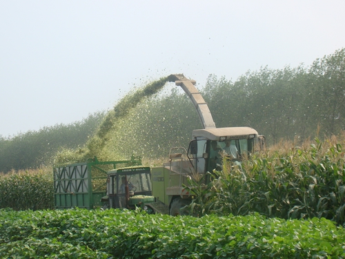 全株青貯,在玉米籽粒乳熟末至蠟熟初期收獲包括果穗在內(nèi)的鮮綠全株,經(jīng)切碎發(fā)酵,用于草食牲畜的飼料。玉米籽粒重量約占全株總干物質(zhì)重量的45%,其消化率可達(dá)到90%以上;莖葉部分占全株總干重約55%,消化率60-70%。優(yōu)質(zhì)青貯玉米應(yīng)有一個結(jié)實(shí)良好的果穗,有較高的籽粒產(chǎn)量,使其既有大量莖葉可消化利用的纖維營養(yǎng),又有籽粒中的淀粉能量營養(yǎng)。全株玉米青貯是生產(chǎn)優(yōu)質(zhì)青貯玉米飼料的主要發(fā)展方向。