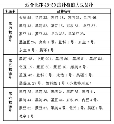 所以,要明確這一生態(tài)條件比較復雜的區(qū)域內適宜種植的大豆品種,還需借助積溫帶來具體說明。在這一緯度范圍內,共有第四積溫帶(2100℃-2300℃)、第五積溫帶(1900℃-2100℃)、第六積溫帶(小于1900℃),我列出了幾種適宜各積溫帶種植的大豆品種。這位農民可以按照當?shù)氐膶嶋H積溫情況選擇對應品種,切忌越區(qū)種植,造成不必要的損失。