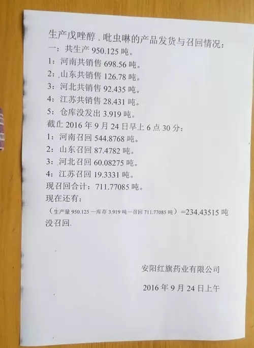 目前,生產(chǎn)廠家安陽紅旗藥業(yè)有限公司已通過經(jīng)銷商等渠道,確認(rèn)可以召回約711噸制劑。由于售出時(shí)間和散戶購買等原因,仍有超過230噸制劑不能找到買主。據(jù)提制劑供配方的北京北九環(huán)境技術(shù)實(shí)驗(yàn)室技術(shù)人員介紹,這230多噸制劑如果被使用的話,可能會(huì)導(dǎo)致150萬畝小麥出苗不足,從而造成減產(chǎn)。