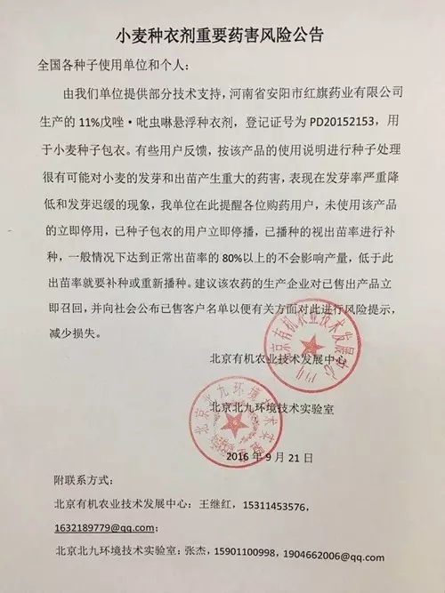 近日,北京有機(jī)農(nóng)業(yè)技術(shù)發(fā)展中心、北京北九環(huán)境技術(shù)實(shí)驗(yàn)室與河南安陽市紅旗藥業(yè)有限公司聯(lián)系中國鄉(xiāng)村之聲,要求通過媒體發(fā)布緊急公告,提醒廣大小麥種植戶:千萬不要再使用他們生產(chǎn)的11%戊唑·吡蟲啉懸浮種衣劑,因?yàn)榘丛摦a(chǎn)品的使用說明進(jìn)行種子處理,很有可能對(duì)小麥的發(fā)芽和出苗產(chǎn)生重大的藥害,表現(xiàn)在發(fā)芽率嚴(yán)重降低和發(fā)芽遲緩的現(xiàn)象。