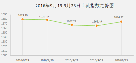 本周期末(2016年9月23日)的1665.37比上周期末(2016年9月14日)的1665.37,上升8.85個基點(diǎn),跌幅為0.5%。本周土流指數(shù)較去年同期(2015年9月23日)上漲7.2個百分點(diǎn),比年初上漲7.7個百分點(diǎn)。土流指數(shù)整體呈現(xiàn)上升趨勢。