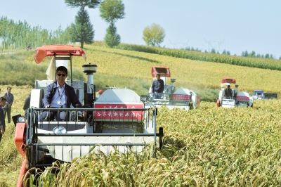 金秋時節(jié),在山西省忻州市繁峙縣金山鋪鄉(xiāng)郝家灣村,農(nóng)民們在山西農(nóng)業(yè)大學農(nóng)學院郭平毅教授的幫助下解決了谷子秋收效率低的問題。收割、晾曬、脫粒、分選……農(nóng)民傳統(tǒng)的谷子收割模式既費時又費力,郭平毅教授帶領(lǐng)的“谷子團隊”研發(fā)出的聯(lián)合收割機可一次性完成所有收割工序,單臺機械每小時收割3-5畝,有效降低了用工成本,將在山西省范圍內(nèi)示范推廣。圖為9月28日,山西農(nóng)業(yè)大學郭平毅教授(前)在操作谷子聯(lián)合收割機。 曹陽攝新華社發(fā)