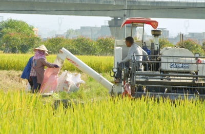 圖為10月4日,一臺收割機(jī)在該縣車江大壩收割晚稻,兩名婦女將糧食裝袋。劉進(jìn)銀本報記者劉久鋒攝