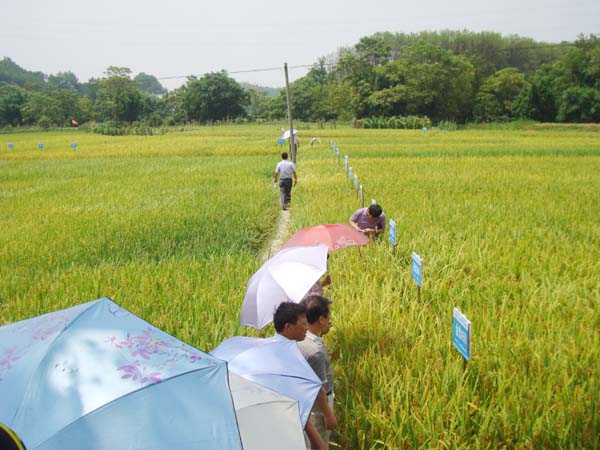 參會人員前往筠門嶺鎮(zhèn)黃埔村、文武壩鎮(zhèn)勤建村現(xiàn)代農業(yè)晚稻新品種展示基地進行現(xiàn)場觀摩,聽取了縣種子管理站負責人有關展示品種的農藝性狀介紹,對各品種株型、整齊度、抗性等綜合性狀進行了認真考察,對各品種栽培技術、生育期等特征特性進行了詳細記載。