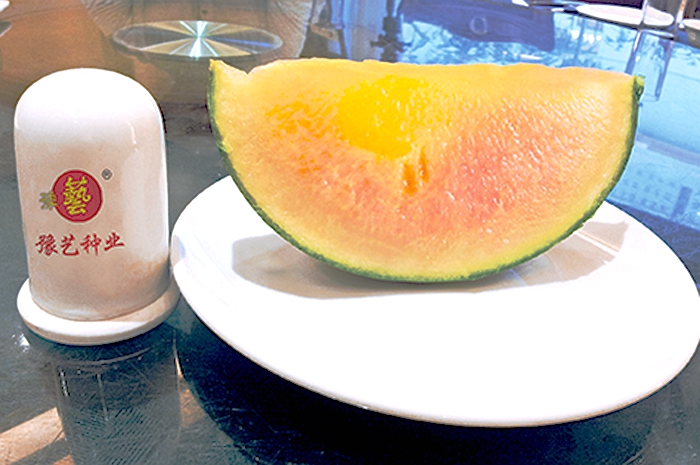 “彩虹館之寶”,顧名思義,它的瓜瓤是七彩斑斕的?其實(shí),并不是。由于它的瓜肉瓤色很特別,紅橙、乳黃相間,所以西瓜縱切時(shí),剖面看起來像彩虹似的,所以取名“彩虹瓜之寶”。而當(dāng)你橫切它時(shí),剖面又帶有隱約的花朵形狀,還真是神奇呢!從外觀上看,它小巧玲瓏,細(xì)條帶花皮,皮的厚度看起來也只有一毫米。一名觀眾品嘗了“彩虹瓜之寶”后說,味道獨(dú)特而甜美,有一種入口即化的感覺,這么嬌弱、可愛、甜美的彩虹瓜,怪不得叫“寶”呢!