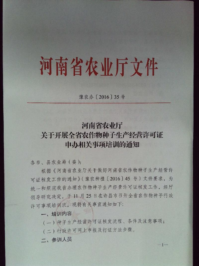 河南省農(nóng)業(yè)廳關(guān)于開展全省農(nóng)作物種子生產(chǎn)經(jīng)營許可證申辦相關(guān)事項培訓(xùn)的通知