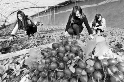 12月7日,在江蘇省盱眙縣澳吉爾國際綠博園,工作人員在采摘“櫻桃蘿卜”。