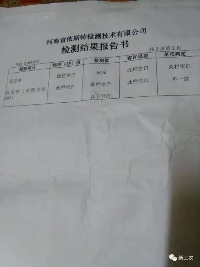 為了驗證這批農(nóng)樂牌百農(nóng)207到底有沒有質(zhì)量問題,張素華先后到在多家種子檢測單位進行了求證。周口市農(nóng)業(yè)局種子質(zhì)量監(jiān)督檢驗站(2016年10月9日出具檢測報告:發(fā)芽率≤80%,品種真實性與外包裝不一致),河南省依斯特種子檢測技術(shù)有限公司(2016年10月19日出具檢測報告:發(fā)芽率≤64%、品種真實性不一致)均檢測到這批”農(nóng)樂牌百農(nóng)207”麥種發(fā)芽率均未達到國家標準(國標≥85%),且與正規(guī)百農(nóng)207品種基因鑒定真實性不一致。