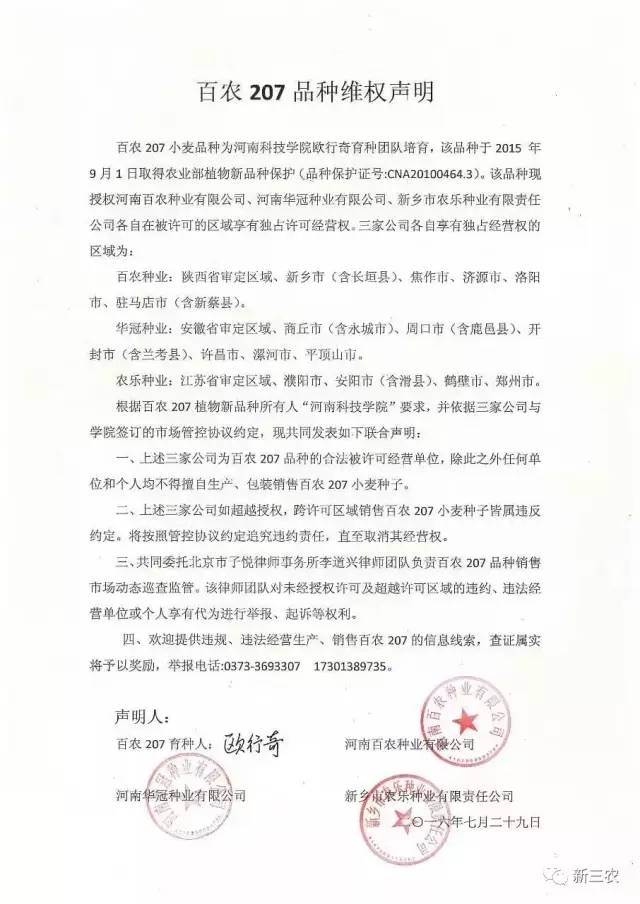 同時,歐行奇指出農(nóng)樂牌百農(nóng)207銷售到周口市鄲城縣,屬于超越授權(quán)范圍的跨區(qū)域銷售行為(今年8月5日《河南科技報》全文發(fā)布了《國審百農(nóng)207品種維權(quán)公告》:授權(quán)河南華冠種業(yè)、河南百農(nóng)種業(yè)、新鄉(xiāng)市農(nóng)樂種業(yè)3家劃區(qū)域經(jīng)銷,農(nóng)樂種業(yè)的銷售區(qū)域不包含周口市)。