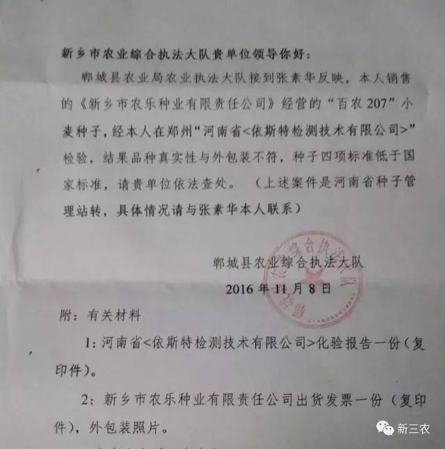 鄲城縣農(nóng)業(yè)局農(nóng)業(yè)執(zhí)法大隊向新鄉(xiāng)市農(nóng)業(yè)執(zhí)法大隊、滑縣農(nóng)業(yè)局農(nóng)業(yè)執(zhí)法大隊及種子管理站發(fā)出了協(xié)查函(種子包裝袋標稱為:新鄉(xiāng)市農(nóng)樂種業(yè)有限責任公司農(nóng)樂百農(nóng)207小麥種子,發(fā)貨地票據(jù)顯示為:滑縣滑豐種業(yè)聯(lián)繁基地留固振勇家庭農(nóng)場)。