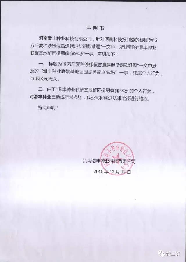 ▲河南滑豐種業(yè)對(duì)滑縣振勇農(nóng)場(chǎng)發(fā)出維權(quán)聲明書