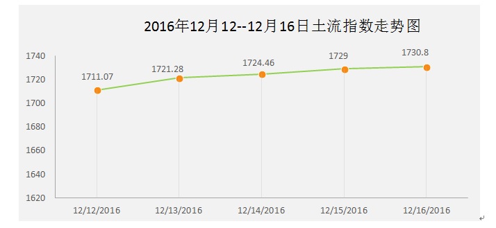 本周土流指數日均為1723.32,較上期1712.79的上漲10.5個基點。本周期末土流指數較去年同期(2015年12月16日)上漲7.7個百分點,比年初上漲11.3個百分點。“土流網·土流指數”整體呈現(xiàn)上升趨勢。