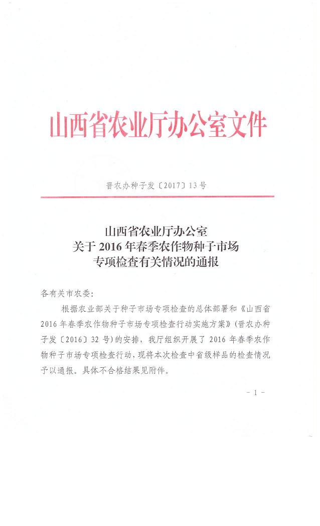 山西農(nóng)業(yè)廳2017年農(nóng)作物種子專項檢查通報