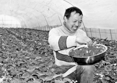 安徽省廬江縣冶父山鎮(zhèn)塘稍組村民孫茂友去年種植了7畝大棚草莓,品種是“紅顏”,該品種果實(shí)質(zhì)密多汁,香味濃郁,糖度高,風(fēng)味極佳,果實(shí)硬度大耐貯運(yùn),果實(shí)采收期長,可從春節(jié)前后一直持續(xù)到5月上中旬。他采用水肥一體化栽培,產(chǎn)出的草莓深受市場歡迎,每公斤批發(fā)價(jià)達(dá)到28元。圖為春節(jié)前夕,孫茂友在大棚里采摘草莓。 張傳保攝