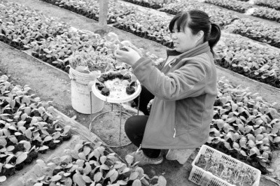 春節(jié)期間,劉淑芳培育嫁接的早熟新品西瓜苗新優(yōu)6號(hào)一棵賣出一元錢,半畝地凈掙3.2萬(wàn)元,第二茬嫁接的4萬(wàn)余棵瓜苗也被預(yù)訂,兩個(gè)多月收入7萬(wàn)多元。目前,當(dāng)?shù)赜鐪嘏镉赏甑?00座增至1600余座,計(jì)劃培育西紅柿、西瓜、辣椒、包菜、香瓜等20多個(gè)種類瓜苗1.3億株,合作社呈現(xiàn)出一派人勤春早的繁忙景象。