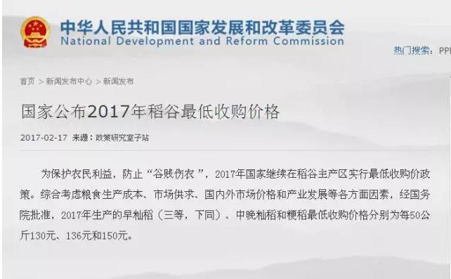據(jù)國家發(fā)改委網(wǎng)站消息,為保護農(nóng)民利益,防止“谷賤傷農(nóng)”,2017年國家繼續(xù)在稻谷主產(chǎn)區(qū)實行最低收購價政策。