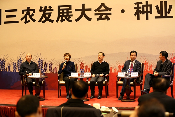 “種業(yè)發(fā)展的喜與憂”主題沙龍現(xiàn)場(chǎng)。嘉賓由左至右為中國(guó)種子協(xié)會(huì)副會(huì)長(zhǎng)李立秋、農(nóng)業(yè)部種子管理局副局長(zhǎng)吳曉玲、山東登海種業(yè)股份有限公司董事長(zhǎng)陶旭東、禾中控股集團(tuán)有限公司董事局主席趙銀虎天津德瑞特種業(yè)公司總經(jīng)理馬德華。