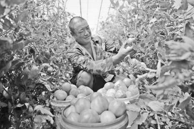 近日,河北省饒陽縣北歧河村民葛振宗家的溫室大棚一片熱氣騰騰的景象:滾圓潤紅的西紅柿掛滿綠色的枝頭,葛振宗和臨時雇來的四五個村民正拎著桶,滿頭大汗忙著收獲成熟的西紅柿。