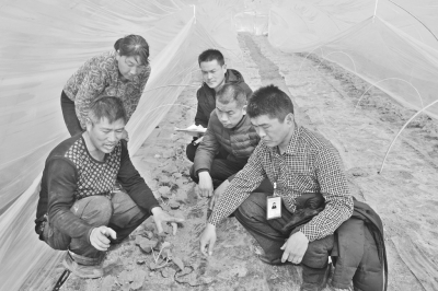 2月28日,安徽省宿州市埇橋區(qū)曹村鎮(zhèn)農(nóng)技人員在種瓜大戶張大賀(左)大棚內(nèi)觀測(cè)“玉姑”新品種瓜生長(zhǎng)情況。張大賀夫妻在上海郊區(qū)打工13年,主要租地種植良種瓜菜,去年全家?guī)еY金技術(shù)回到家鄉(xiāng),在206國(guó)道西側(cè)流轉(zhuǎn)土地100余畝,投入110萬(wàn)元?jiǎng)?chuàng)辦“精品西瓜示范園”,先期建成190個(gè)西瓜大棚,主要種植“8424”和“玉姑”新品種西瓜,“五一”節(jié)前開(kāi)始供應(yīng)上海及周邊城鄉(xiāng)市場(chǎng)直到中秋節(jié),預(yù)計(jì)產(chǎn)量達(dá)400噸,產(chǎn)值300萬(wàn)元。張從本張熠攝