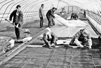 缽育毯式超早育苗的各項準備工作。據(jù)悉,這個分公司今年示范種植“稻花香二號”優(yōu)質水稻品種500畝,采取缽育毯式超早育苗技術可實現(xiàn)早育苗、早插秧、搶積溫,促進水稻增產(chǎn)豐收。圖為工人在進行擺盤作業(yè)和鋪設保溫膜。 劉江攝