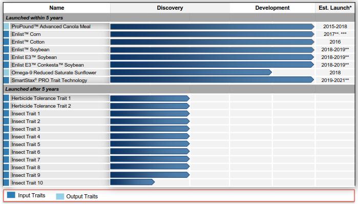 陶氏預(yù)測(cè)Enlist™大豆的市場(chǎng)面積可達(dá)5000萬(wàn)英畝,Enlist™玉米市場(chǎng)約4000萬(wàn)英畝,Enlist™棉花市場(chǎng)為1000萬(wàn)英畝。陶氏預(yù)計(jì)另一個(gè)強(qiáng)勁產(chǎn)品PowerCore™玉米的市場(chǎng)面積將會(huì)達(dá)到1億英畝,該產(chǎn)品可有效防治地上廣譜害蟲(chóng)。預(yù)計(jì)在2018-2021年在美國(guó)和加拿大推出的SmartStax®PRO玉米是第一種針對(duì)地下害蟲(chóng)的具有三種作用模式的產(chǎn)品,抗蟲(chóng)效果良好,陶氏預(yù)測(cè)SmartStax®PRO玉米的市場(chǎng)面積可達(dá)1億英畝。