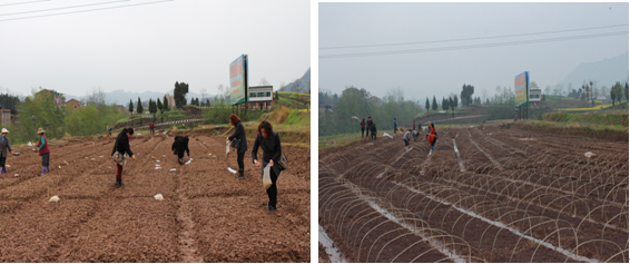 一是義工幫扶:針對(duì)目前農(nóng)村勞動(dòng)力欠缺,在家務(wù)農(nóng)大多屬老人,單位組織專業(yè)技術(shù)人員深入田間地頭,幫助戶主進(jìn)行試驗(yàn)播種、蓋膜等。