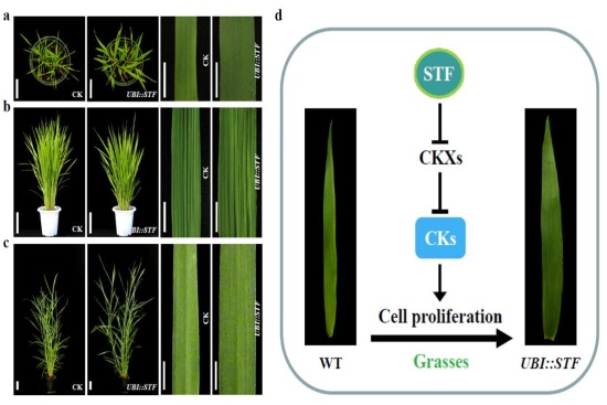 生物所通過與美國俄克拉荷馬州立大學(xué)、塞繆爾•諾貝基金會(huì)和中科院等單位開展合作研究,發(fā)現(xiàn)過表達(dá)WOX家族基因STF能夠引起水稻、二穗短柄草和柳枝稷等禾本科植物的葉片變寬、加厚,莖稈粗壯,光合效率明顯提高,抗倒伏能力顯著增強(qiáng)。統(tǒng)計(jì)分析發(fā)現(xiàn)過表達(dá)STF柳枝稷的生物產(chǎn)量增加近一倍,同時(shí)刈割后柳枝稷材料再生能力顯著增強(qiáng),表明葉型控制基因STF在提高禾本科作物生物產(chǎn)量方面的巨大應(yīng)用潛力。進(jìn)一步研究發(fā)現(xiàn)STF基因通過直接抑制植物細(xì)胞分裂素氧化酶家族基因表達(dá),導(dǎo)致植物體內(nèi)植物激素細(xì)胞分裂素的動(dòng)態(tài)平衡發(fā)生改變。上述研究工作初步揭示了WOX家族基因STF影響植物葉型發(fā)育的分子調(diào)控機(jī)制,為作物高光效遺傳改良和育種實(shí)踐提供了重要的理論基礎(chǔ)。