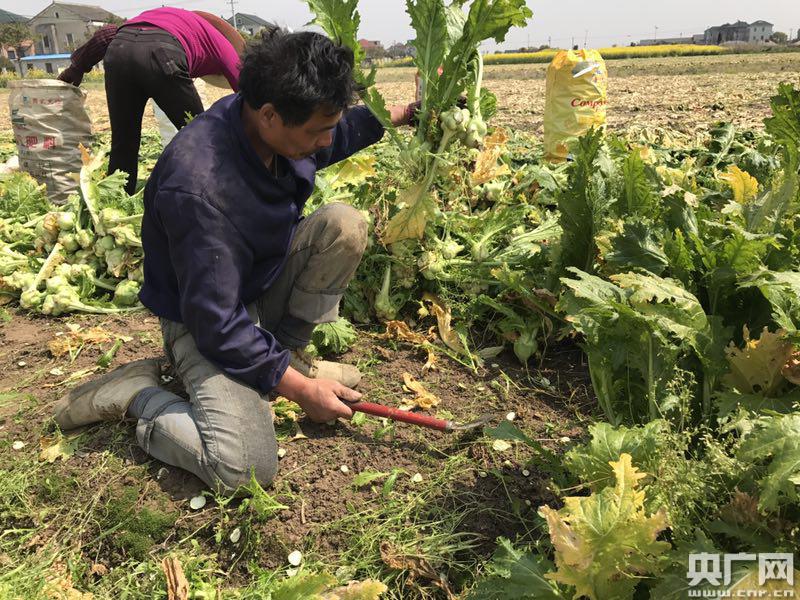 “愁賣,到處在減價,基本上上午一個價,下午又減價。我們從5毛賣到現(xiàn)在3毛6。”在余姚市泗門鎮(zhèn)楝樹下村,張鋒龍家里種了5畝多榨菜,往年每畝產(chǎn)量在7000斤左右,今年畝產(chǎn)超過1萬斤,但由于價格持續(xù)走低,高產(chǎn)并沒有給他們家?guī)砀叩氖杖搿?/p>