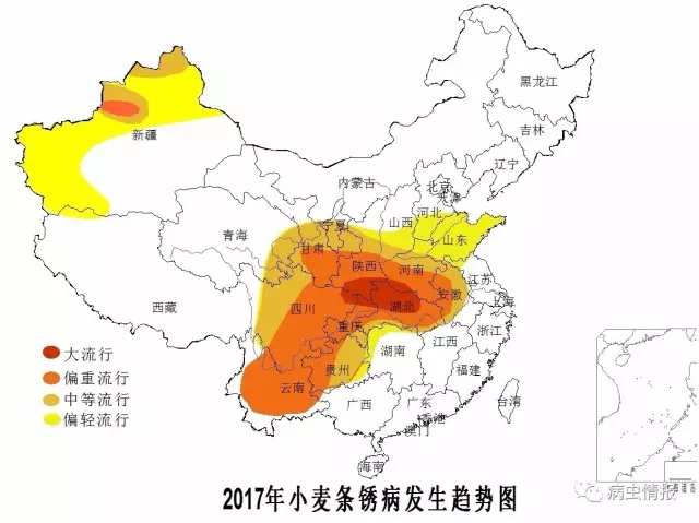 總體偏重發(fā)生,重于上年和近年,發(fā)生面積約5000萬畝。其中,漢水流域大發(fā)生,西南大部、黃淮南部和西北東南部及新疆北部偏重流行,黃淮北部和西北部分麥區(qū)中等流行,華北等其他麥區(qū)偏輕發(fā)生。流行盛期,西南和漢水流域為4月份,黃淮和華北南部為4月中旬至5月中旬,西北冬麥區(qū)為5月中旬至6月中旬、春麥區(qū)為6月下旬至7月下旬。