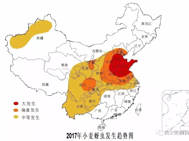 穗期總體大發(fā)生,重于常年,發(fā)生面積2.4億畝。其中,黃淮北部和華北麥區(qū)大發(fā)生,四川盆地、江淮、西北大部偏重發(fā)生,其他麥區(qū)中等發(fā)生。為害盛期,西南大部為4月中下旬,江淮和黃淮為4月下旬至5月中旬,華北和西北冬麥區(qū)為5月上旬至6月上旬,西北春麥區(qū)為6月下旬至7月下旬。