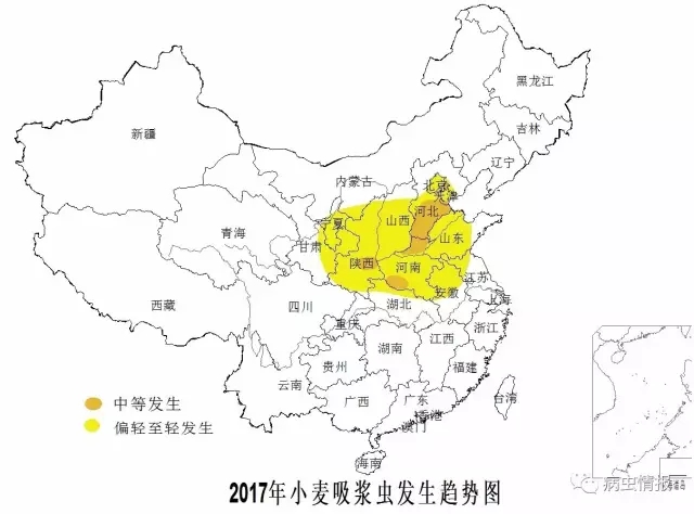 總體偏輕發(fā)生,接近上年,輕于常年,發(fā)生面積2600萬畝。其中,北京、天津、河北、陜西、河南、山東等?。ㄊ校┎糠蛀渽^(qū)局部地塊可能出現(xiàn)嚴重為害。成蟲羽化盛期為4月中旬至5月上旬。