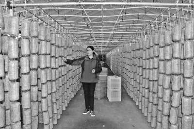 圖為4月10日,苗根梅在生產(chǎn)車間查看菌包生長情況。