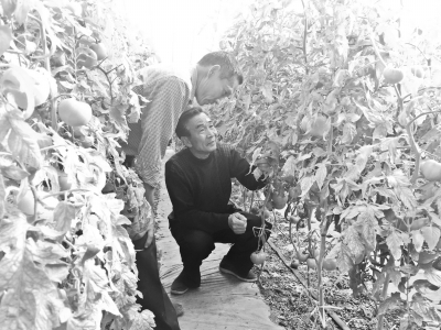 馬成三(右)正在查看西紅柿長勢韓超攝