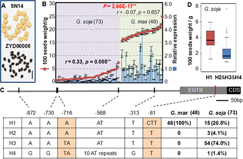 圖:SoyWRKY15a參與大豆種子大小的馴化。(A)栽培大豆SN14和野大豆ZYD00006的種子;(B)SoyWRKY15a在大豆果實(shí)中的表達(dá)與百粒重的關(guān)系;(C)SoyWRKY15a調(diào)控區(qū)單倍型變異情況;(D)野大豆SoyWRKY15a單倍型變異與種子大小。