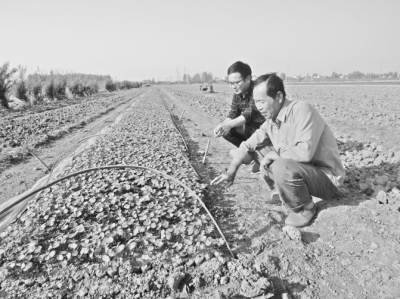 湖北省漢川市刁東街道辦事處新樂村原黨支書張春成,近十年來,每年承擔(dān)國欣種業(yè)近20個棉花新品種(系)的展示工作,與來至省內(nèi)外的客戶參觀交流高產(chǎn)植棉經(jīng)驗。圖為張春成(前)與國欣種業(yè)南方大區(qū)經(jīng)理劉飛在檢查棉花苗情。 余宏章文/圖