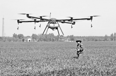 圖為工作人員在河北省泊頭市東望江店村操作無人機對小麥進行“一噴三防”作業(yè)。新華社記者牟宇攝