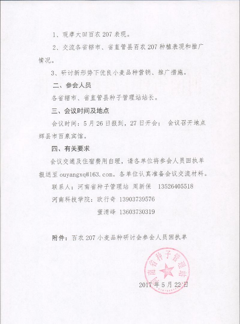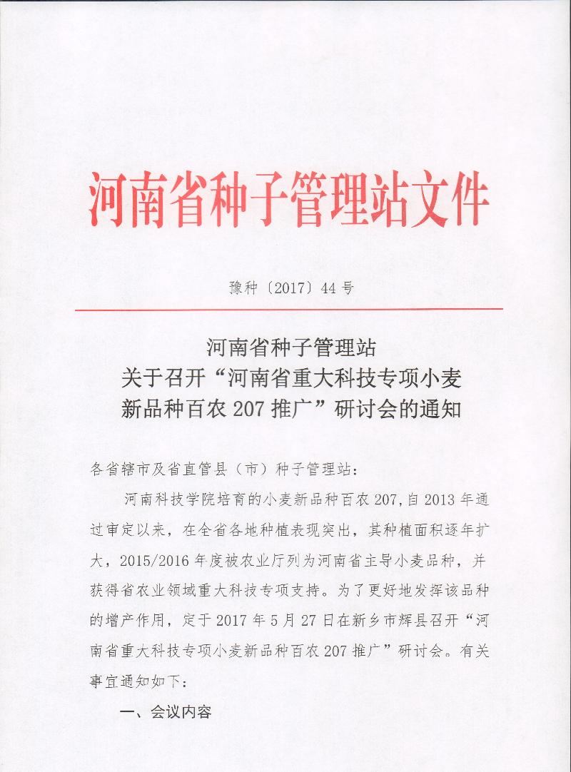 河南重大科技專(zhuān)項(xiàng)小麥新品種百農(nóng)207推廣研討會(huì)通知