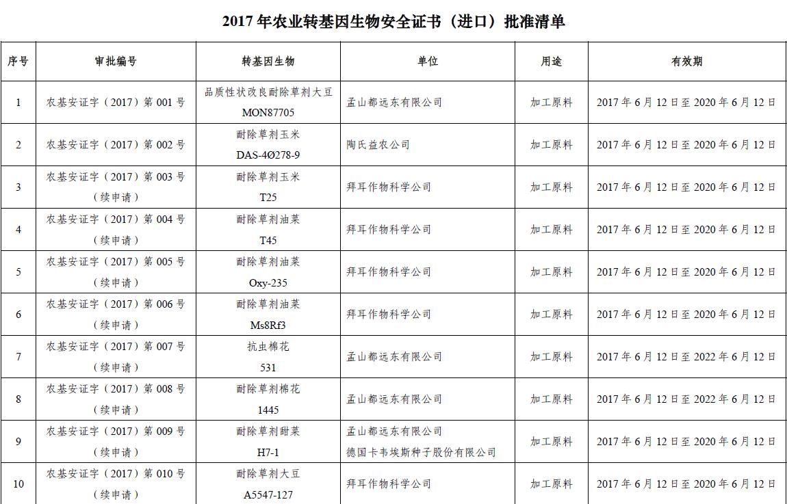 生物安全證書進口清單,批準孟山都、拜耳 、先正達、陶氏益農(nóng)等