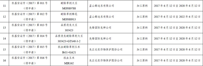 等16個產(chǎn)品用作加工原料,有效期自2017年6月12日至2020年6月12日。
