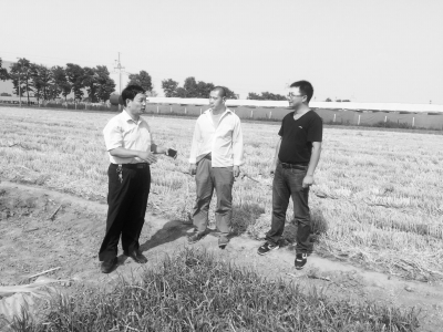 6月17日,史彩華(右一)和張利煥(左一)指導(dǎo)韭菜種植戶趙金波在田間應(yīng)用日曬高溫覆膜法。
