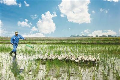5月插秧后,工作人員放鴨子進(jìn)田捕蟲?!⊥鯘h超攝