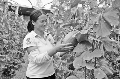 富農(nóng)果蔬扶貧基地內(nèi),工人喜摘“西周蜜”哈密瓜。