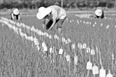 水稻品種和營養(yǎng)土配比等試驗。據(jù)了解,該縣先后引進科研院校技術(shù)團隊,通過建設(shè)博士生科研所、良種培育基地等,為全縣130余個水稻品種配上了“身份證”,全天候、全過程監(jiān)測水稻生育期、綜合抗性、產(chǎn)量品質(zhì)等各個環(huán)節(jié),為今年的水稻豐收打下基礎(chǔ)。圖為6月25日,技術(shù)員在泗洪縣稻米文化現(xiàn)代農(nóng)業(yè)科技園對水稻進行田間管理。 新華社記者周海軍攝
