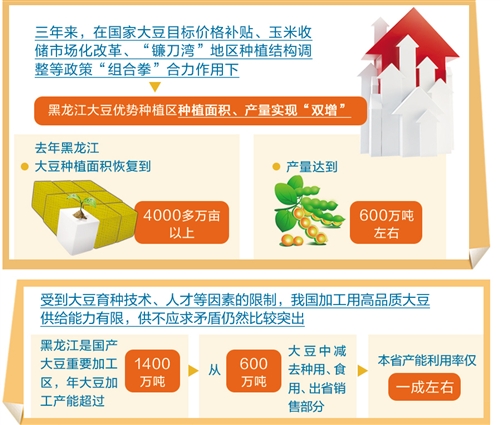近3年來(lái),在國(guó)家大豆目標(biāo)價(jià)格補(bǔ)貼、玉米收儲(chǔ)市場(chǎng)化改革、“鐮刀灣”地區(qū)種植結(jié)構(gòu)調(diào)整等政策“組合拳”合力作用下,黑龍江大豆優(yōu)勢(shì)種植區(qū)種植面積、產(chǎn)量實(shí)現(xiàn)“雙增”,去年黑龍江大豆種植面積恢復(fù)到4000多萬(wàn)畝以上,產(chǎn)量達(dá)到600萬(wàn)噸左右。